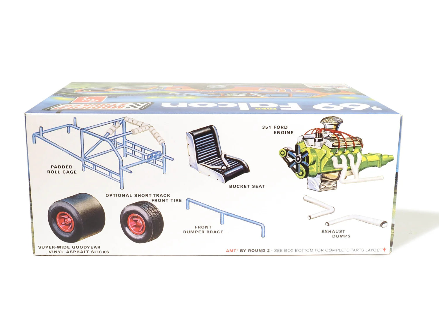 This kit has some great features including a padded roll cage, front bumper braces, bucket seats, exhaust dumps, a 351 Ford engine, pad-printed Goodyear super wide slicks, and an optional short track front tire.