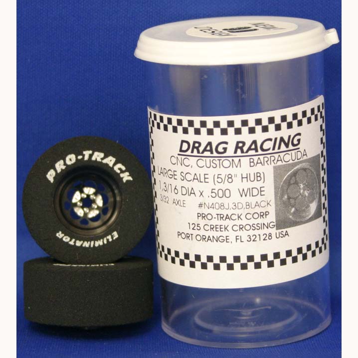 PTMN408J,3DBL - Drag Rear Tires - For 3/32 axle, they are 1 3/16" in diameter and .535 wide. These are the Magnum pattern anodized Black. CNC Machined Custom Drag Wheels with large scale 5/8" hub with Natural "Barracuda" Rubber, square cut with lettering