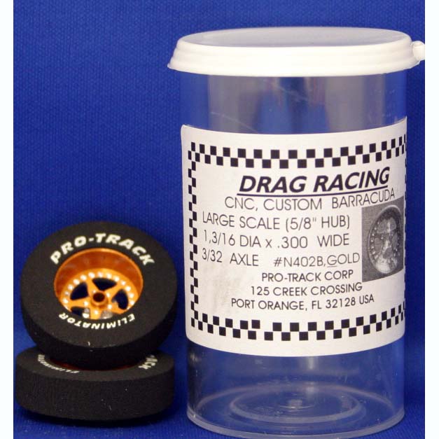 PTMN402B,G - Drag Rear Tires - For 3/32 axle, they are 1 3/16" in diameter and .300 wide. These are the Star pattern. CNC Machined Custom Drag Wheels with large scale 5/8" hub with Natural "Barracuda" Rubber, square cut with lettering. Anodized Gold