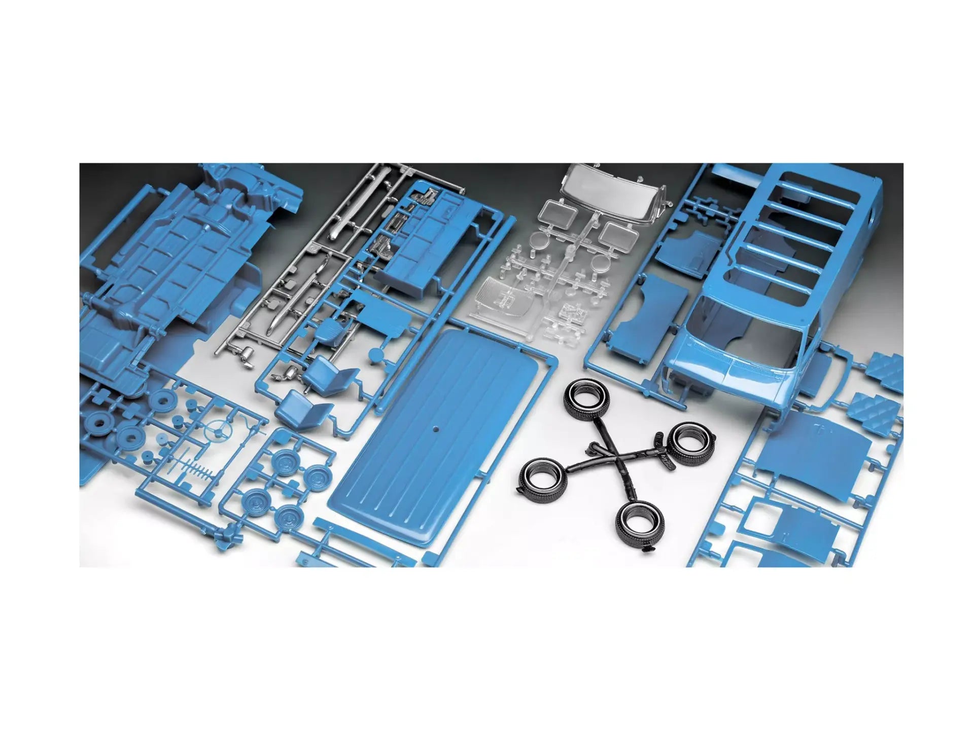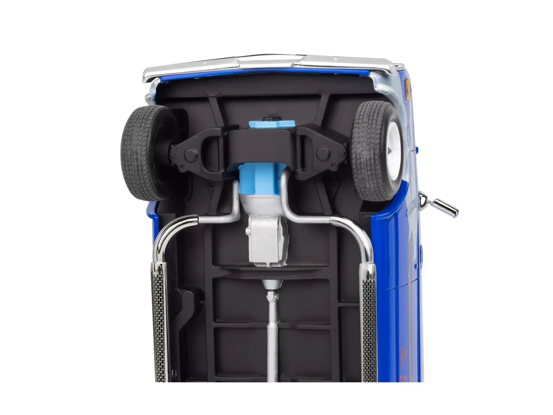 - Molded in blue and clear with chrome parts and soft black tires.